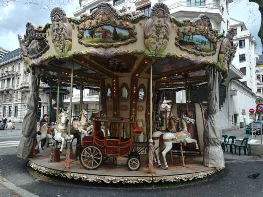 Foto 14: Een ouderwetse draaimolen op het plein naast de olifanten.De tweede dag van mijn verblijf in Chambéry was het weer helaas minder mooi maar ik ging er toch opuit en trapte mijn leenfiets omhoog naar de Col du Chat, een bescheiden pas van 638 meter.