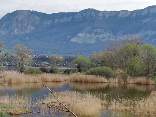 Foto 19: Er was ook een bergrug te zien maar daarvoor had je geen hut nodig en om vogels redelijk te kunnen zien moest je beschikken over dure cameras met lenzen zo groot als kanonnen. In de vogelhut zat een man met dergelijke apparatuur maar die was te druk met het schieten van vogels (op de gevoelige geheugenkaart) om mij op te merken.De vierde dag (Vrijdag 31 maart) begon het weer serieus te verslechteren maar ik zag nog juist kans om droog naar het ca. 10 km ver gelegen Lac St. André te fietsen, een klein maar aardig meertje.