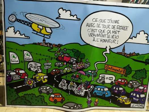Foto 21: Een geestige mop bij de ingang van de festivalhal. Een beetje vrij vertaald: ‘Wat ik het leuke vind van de Tour de France is dat de fiets echt alle eer toekomt.’En vandaag was de tweede en laatste dag van het festival, waarop ik hetzelfde verhaal hield als gisteren, maar dan natuurlijk voor weer een nieuw publiek. Gisteren was ik na 50 minuten ongeveer op 35 procent van mijn verhaal, waarna ik de resterende 65 procent er eenparig versneldde doorheen moest jassen in 9 en een halve minuut. Dat ging dus niet en daarom liep het een kwartier uit. Vandaag moest het dus beter: sneller met minder details. Daardoor konden er na afloop meer vragen worden gesteld, waarvan ik er ook weer enkele te gedetailleerd beantwoordde. Ik eindigde mijn verhaal met foto 22