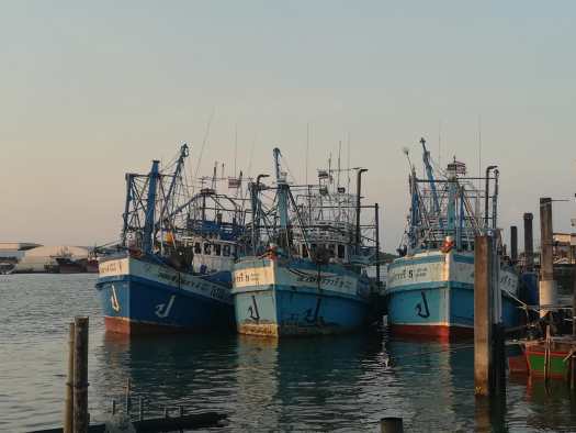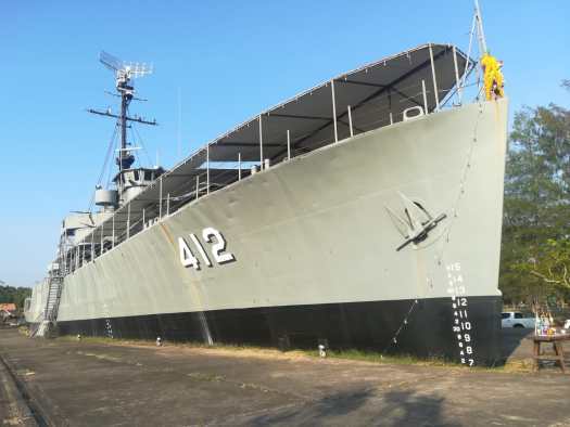 Een dag later zag ik aan de Golf van Thailand iets waar al even serieus hijswerk voor verricht moet zijn: een groot marineschip op het droge.