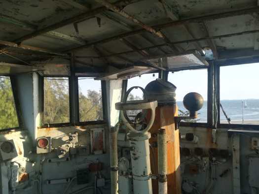 Foto 4: Op de brug van de Prasae. Het zag er allemaal niet blinkend nieuw meer uit, maar toch was het leuk om me, zonder gevaar voor zeeziekte, commandant van een Fregat te voelen. Het schip ligt, niet geheel toevallig, vlak bij het plaatsje Prasae aan de Prasae-rivier. Bij zoiets dringt zich natuurlijk onmiddelijk de vraag op: ‘Wat is naar wat genoemd?’: Het plaatsje naar de rivier? En vervolgens: De rivier naar het schip of omgekeerd? Of: De rivier naar het plaatsje en …… Kortom, heel wat vragen. Drie faculteit, zoals dat in de kansberekening wordt genoemd, dus 3 x 2 x 1 = 6. Het gewoon even aan een voorbijganger vragen zat er, met mijn woordenschat van vijf woorden, niet in, laat staan het antwoord verstaan. Het leek me wel waarschijnlijk dat de rivier er eerder was dan het schip en zeker was het dat de zee er eerder was dan de Prasae, zelfs al lang voordat de naam bestond. Dat waren zo een paar losse gedachten die door mijn hoofd speelden terwijl ik het loze roer van dat grote schip in handen had. Blijkbaar nodigt zo’n maritieme omgeving uit tot diepe gedachten.