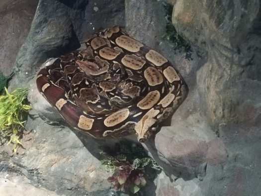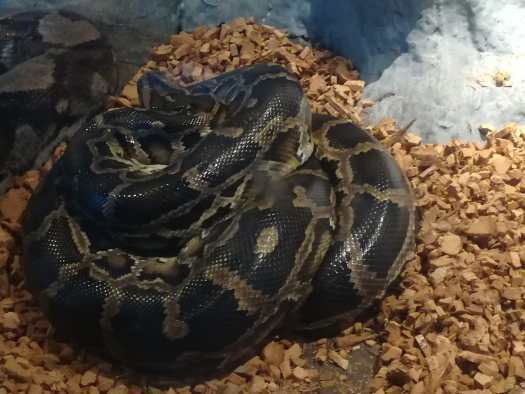 Foto 14: Een Malayopython reticulatus, een lid van de Python- familie. ‘Niet giftig’ volgens het bordje, maar vervelend kan zo’n wurgslang van 10 meter lengte wel worden, dus toch fijn dat er stevig glas tussen hem en mij zat.
