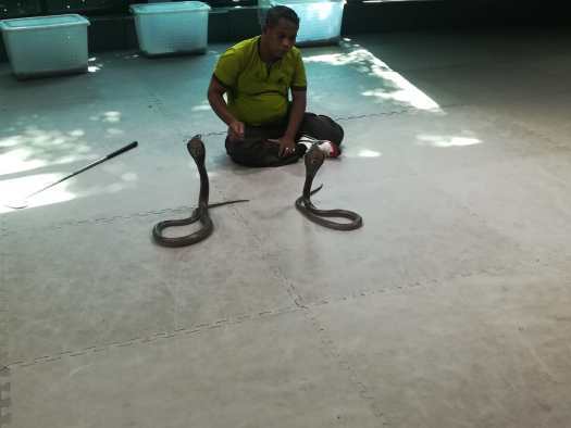 Foto 15: Een Boa constrictor, ‘slechts’ 4 meter lang, maar het blijft oppassen als er zo een voor je op het pad ligt te zonnen.Als toegift kregen de bezoekers een demonstratie van twee slangenbezweerders die lieten zien dat uiterst giftige cobra’s helemaal niet zo gevaarlijk zijn…… als je maar precies weet hoe je moet bezweren en wat je beslist niet moet doen. Het zag er allemaal heel makkelijk uit. Je zou haast zeggen: ”Geef mij ook eens even zo’n cobraatje om het te proberen.” Toch deed geen enkele bezoeker dat.