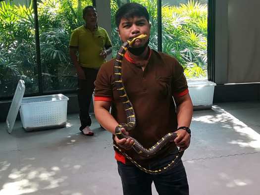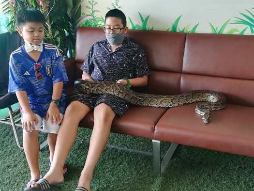 Foto 18: Je mocht ook nog even gezellig een grote python op schoot nemen.Dit ‘huisdier’ was niet giftig en ‘Very friendly’ zoals werd beweerd. Ik vroeg me alleen af hoe lang zo’n wurgslang het uithoud ‘very friendly’ te zijn. Wat nu als hij bij de honderddrieëndertigste toerist plotseling de pest in krijgt en zich zesmaal om zijn slachtoffer slingert om hem vervolgens door te slikken?