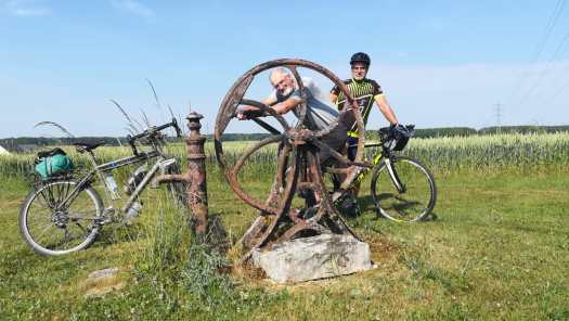 Foto 6: Hier kijkt Bruno, gehelmd en gestoken in onberispelijke fietskleding, geamuseerd toe hoe ik vergeefs water probeer op te pompen met een museumstuk dat een halve eeuw geleden al de geest heeft gegeven. Met de fietsclub van Senonches reed ik de volgende dag een ronde van 90 km door heuvelachtig gebied.