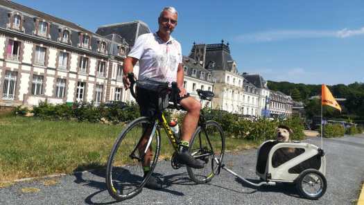 Foto 10: ‘Kasteel-heer’ Bruno op zijn fiets met daarachter zijn trouwe hond Gwenn in een fietscaravan.