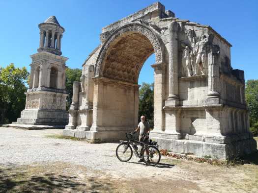 Foto 6: Het mausoleum en de triomfboog van Glanum, juist buiten Saint Remy de Provence. Om een indruk te geven van de grootte van de triomfboog ben ik er zelf voor het gemak even voor gaan staan.