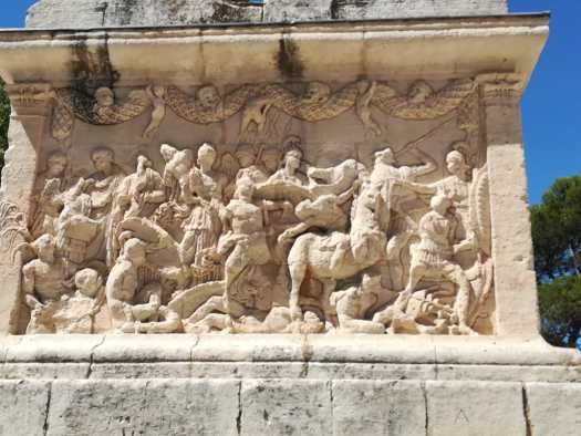 Foto 7: Eén van de vier tableaus onderaan het Mausoleum, een uit steen gehouwen Romeins stripverhaal.