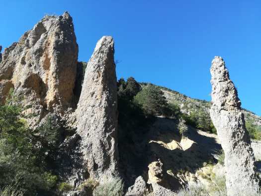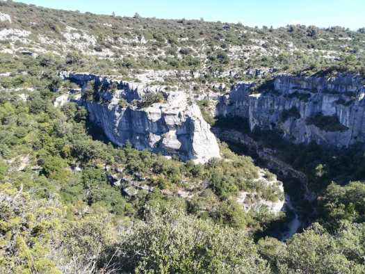 Foto 1: Canyon in de buurt van Murs.Op de afdaling naar de bodem van de kloof kwam ik langs de ruïne van een molen waar in het verleden graan vermalen werd. De molen werd in zijn glorietijd aangedreven door water. Nu spoelt het water dat voor de aandrijving zorgde er doelloos langs aangezien de schoepen en het meeste van de molen vergaan zijn. Slechts een paar stukken muur, waar bomen en takken doorheen groeien en klimop zich tegen omhoog werkt, resten nog van de eens zo mooie en ongetwijfeld degelijke molen. De molenaar was ondertussen ook verdwenen, ongetwijfeld al eeuwen geleden, en verder was er geen mens. Ik had de molen en de canyon dus voor mij alleen.