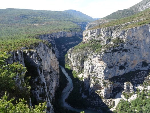 Foto 5: Een meander van de kloof, gezien vanaf de rand.Het was warm in de Provence, lekker warm. Zo nu en dan een hittegolfje doet een mens goed. Regelmatig een hittegolfje is zelfs beter. Geen gedoe met jassen, handschoenen, mutsen en regenpakken. Gewoon fijn fietsen met je petje op en eventueel wat zonnecrème op je oren en armen. Wel is het belangrijk dat je genoeg drinkt. Er zijn mensen die dan een kopje thee drinken, maar dat helpt bij 40 graden natuurlijk net zo weinig als een druppel op een kubieke meter gloeiend staal. Bij 40+ droog je uit waar je bij staat en soms zelfs zonder het in de gaten te hebben. Sommige fietsers zag ik water over hun hoofd gieten voor de afkoeling. Daar wordt je flink nat van en misschien ook wel een beetje koel, maar tegen uitdroging helpt dat natuurlijk niet. Het enige dat werkelijk helpt tegen uitdroging is water en wel in grote hoeveelheden. Een ijskoude cola geeft energie en smaakt na een eind rijden bij tropische temperaturen goddelijk, maar daar kun je geen liters van naar binnen gieten. Dus drink plenty water!!