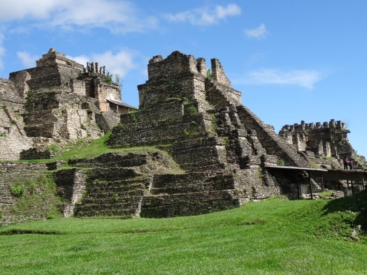 De oude Mayastad Zaculeu werd in 1525 door de Spanjaarden onder aanvoering van Gonzalo de Alvarado veroverd. Later raakte het in verval en stonden de oude piramides, forten en andere gebouwen te verpieteren onder invloed van weer en wind. In de jaren veertig van de vorige eeuw bemoeide de United Fruit Company zich er echter mee. Ze smeten er wat geld en veel beton tegenaan, zodat na deze rigoureuze ‘restauratie’ alles dik onder een gloednieuwe beschermlaag van cement zat. Hierna konden regen, wind en kwaadwillende lieden de boel niet verder ruïneren. De ruïnes konden (en kunnen!) er na deze ‘opknapbeurt’ weer flink wat millennia tegen. Mooi geregeld! Als hier over vijftig miljoen jaar een ruimteschip van een andere planeet landt, zullen de astronauten die daar uit klauteren blij verrast zijn een bijna puntgave Mayastad aan te treffen, als Tikal, Palenque, Toniná, Chichen Itza en vele andere allang tot gruis vergaan zijn. Ze zullen dan wel een paar jaar flink moeten bikken en hakken om al dat 20ste eeuwse beton er weer af te krijgen, maar dan hebben ze ook wat moois! Dan kunnen ze thuis over de wonderlijke Mayawereld vertellen en er prachtige foto’s van vertonen. Heel plezierig en interessant voor de bevolking van die verre planeet, maar jammer voor ons aardbewoners van het derde millennium, dat wij er niets aan hebben. Voor ons blijven de echte piramides en andere monumenten van Zaculeu verborgen onder die dikke betonnen bunker. De metselaars van de Fruit Company hebben er echter wel voor gezorgd dat de vormen van de gebouwen bewaard zijn gebleven en als je nu maar flink je best doet, je voor te stellen hoe ze er in de tijd van de Maya’s hebben uitgezien, kan het toch nog een machtig interessante plek worden.