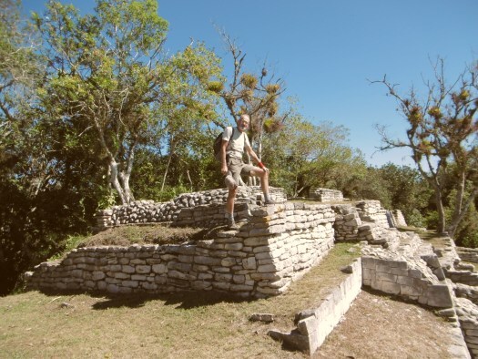 Bij een chips- en pindaverkoopstertje kocht ik een plastic bekertje pinda’s en zette me daarmee bovenop de piramide. Op dit soort bijzondere plaatsen smaken pinda’s toch anders dan die thuis uit de supermarkt, zelfs terwijl je kijkt naar een documentaire over de Maya’s.