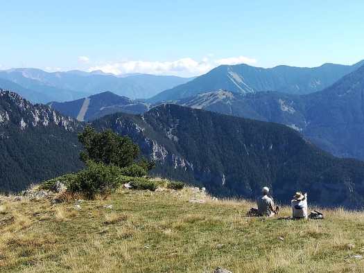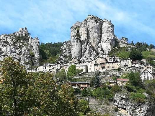 Foto 7: En nog een mooi uitzicht over de Gorges du Verdon.Waar ik minder van genoot waren de motorrijders die in grote getale over de kronkelende weg langs de kloof kwamen langs scheuren. Er waren zeker ook nette motorrijders die je nauwelijks hoorde, die rustig reden en die van de imponerende natuur genoten, maar velen denderden met loeiend geweld langs, vaak in grote groepen. Hoe sneller en hoe meer lawaai, hoe fijner. De echte helden denderden zó hard en schuin door de bochten dat ze er bijna uit vlogen, waarbij ze juist even met de knie de grond raakten. Een centimeter lager en zo’n ‘held’ zou als een raket de canyon in gelanceerd worden, waarbij hij alles op zijn weg zou meesleuren en verpletteren. Geweldig voor een postume onderscheiding van moed in de vorm van een kruis aan de kant van de weg, maar jammer voor de fietser die zich toevallig in zijn lanceerbaan zou bevinden. Merkwaardig dat er tegenwoordig zoveel regeltjes op elk gebied zijn van wat moet en wat niet mag, maar dat deze vorm van terreur ongestraft blijft. Die motorduivels mogen blijkbaar alles. Of gaan ze te snel voor een agent om ze te bekeuren en zijn ze te gevaarlijk om ze aan te pakken?