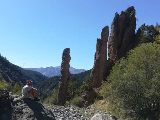 Foto 19: De Toren van Babel, nog steeds op de wandeling door de okergroeve. Niet geheel tot in de hemel, maar toch wel al een heel eind in de goede richting.Op de route van Rousillon naar Carpentras kwam ik door het dorpje Murs. Daar dicht in de buurt lag een aardige camping. Aangezien ik door al die bezoeken van mooie dorpjes en interessante plekken aan een rustdag toe was ging ik er een kijkje nemen. Ik kwam er halverwege de middag aan en de camping ademde een grote rust, precies wat ik nodig had voor een rustdag. Geen zwembad, speeltuin, bar, kindercrèche, tafelvoetbaltafels of andere inrichtingen waar bezoekers zich konden vermaken. Ik zag er slechts twee caravans, een camper en twee tenten, maar er was op dit vroege uur nog geen sterveling te zien. Een van die twee tenten zag er echter wel een beetje dreigend uit, want die was bijna zo groot dat je er in kon tennissen. Wat nu als daar een familie van pa, ma en acht kinderen, variërend in leeftijd van 2 tot 16 jaar in woonde? Een huilende baby, de oudste zoon die tegen de avond met zijn brommer rondjes ging trekken over de camping, de op een na oudste die zijn drumstel had meegenomen om te oefenen en de rest die luid joelend tikkertje en verstoppertje ging spelen tot ver in de nacht? Daarmee zou het gedaan zijn met deze heerlijke rust. Daarom zette ik mijn tent maar een redelijk eindje bij deze gigant vandaan.