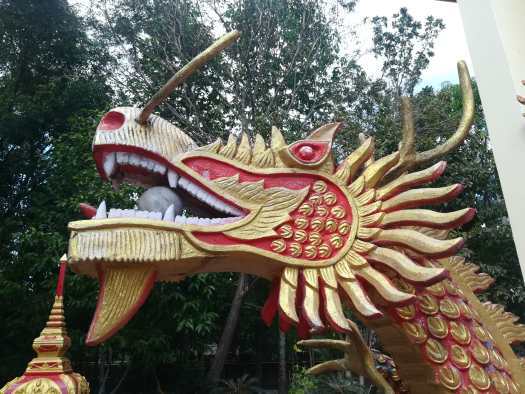 Foto 2: Bert voor een forse Naga, de mythische draak uit het Boeddhisme, die heiligdommen bewaakt.Naga’s hebben vaak meerdere koppen: 1, 3, 5, 7 of meer. Altijd een oneven aantal omdat er steeds één in het midden zit en het geheel wel netjes symmetrisch moet blijven.