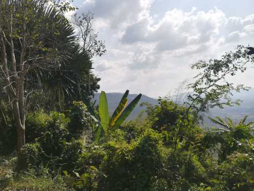 Foto 18: Ik daalde weer af naar mijn fiets en reed terug naar het guesthouse aan het meer. Op een paar kilometer afstand van de rotsheuvel maakte ik nog een fotootje achterom. Waar zit de Witte Boeddha?Terug bij het meer vond ik de geheel relaxte Bert, klaar voor het volgende traject van zijn reis: naar het zuiden van Thailand. Mijn doel was Vientiane in Laos.