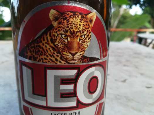 Foto 4: Thais bier. Terug in de bewoonde wereld kwam ik langs een gigantisch gouden beeld. Ik vroeg aan de omstanders wie die gouden man was, maar kreeg daar geen duidelijke antwoord op. Het stond wel met koeieletters onder het beeld geschreven, maar helaas in het Thai. Ik ben op deze reis dus weer een analfabeet.