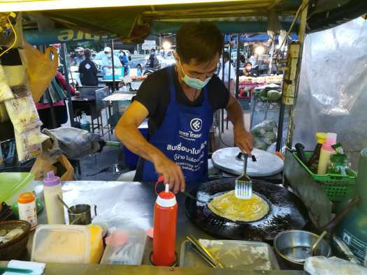 Foto 8: De pannenkoekbaas was druk bezig voor mij een pannenkoek met siroop te prepareren, zo druk zelfs dat hij niet opkeek voor de foto.Leuk zo’n pannenkoek, maar tijdens het eten ervan droop de warme siroop er van onder uit en kwam pal op mijn keurige broek terecht. Het is dus niet alleen een kunst om zo’n pannenkoek te fabriceren, maar ook om hem op een nette manier te eten.