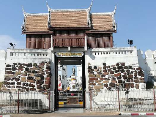 Foto 9: Het Thao Suranari Monument in Nakhon Ratchasima. Op de achtergrond de enige overgebleven originele stadspoort.In 1826 organiseerde Thao een opstand tegen de Laotianen die de stad bezet hadden. Alle vrouwen moesten de Laotiaanse soldaten verleiden en dronken voeren. Toen dat gebeurd was, was het voor die vrouwen een koud kunstje om een bloedbad aan te richten onder die soldaten. Daarom is deze Thao nu de heldin van Thailand!