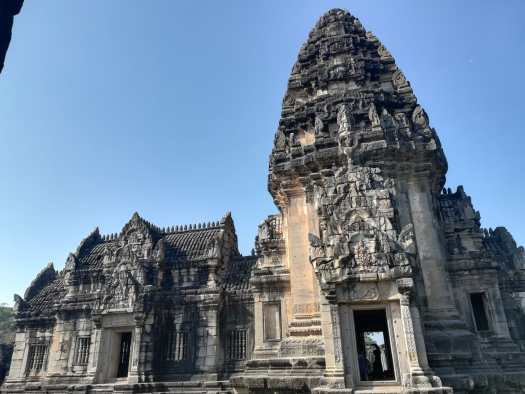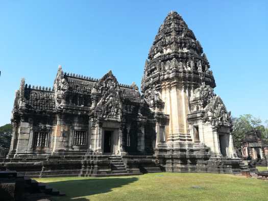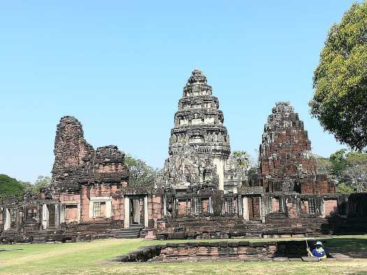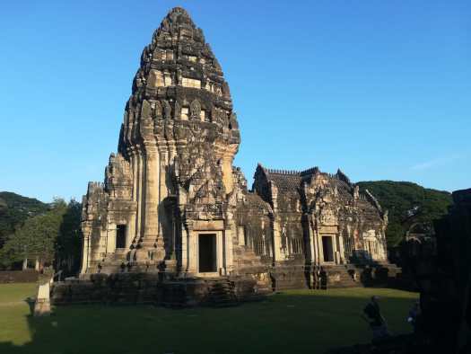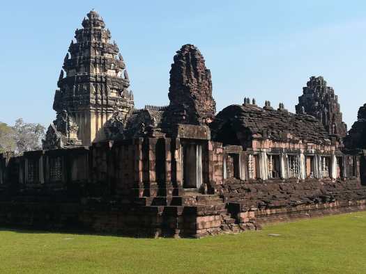 Koning Jayavarman V die van 968 tot 1001over het Khmer rijk regeerde liet de eerste steen leggen van het 565 m bij 1030 m metende tempelcomplex van Phimai. Na die eerste steen liet hij er nog tienduizenden, zo niet honderdduizenden bij, naast en op leggen, maar ondanks al die stenen was het werk niet klaar toen hij voorgoed de ogen sloot. Zijn opvolger Suriyavarman I, ons allen bekend uit de geschiedenisboekjes van de lagere school, liet het werk afmaken. Nadat het oude Khmer rijk afbrokkelen, brokkelden er ook heel wat stenen af, maar tussen 1964 en 1969 werd de tempel van Phimai uiterst secuur gerestaureerd door Thaise en Franse archeologen. En nu kunnen we om en door de tempel met bijgebouwen lopen zoals de oude priesters deden, mits we ons toegangskaartje maar netjes kopen bij het loketje bij de oude stadspoort.