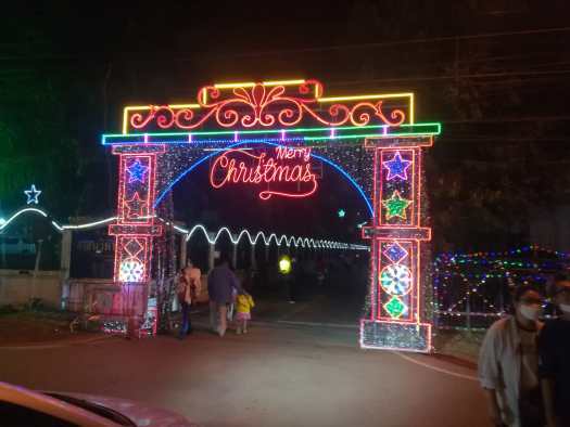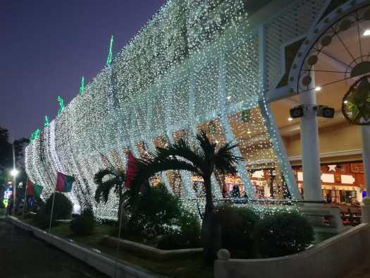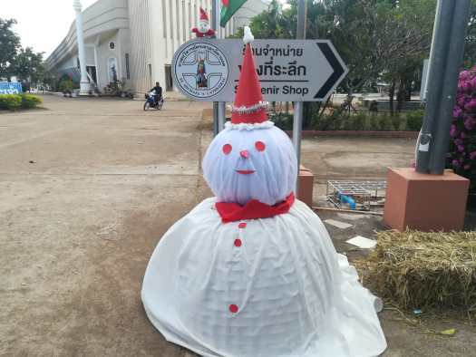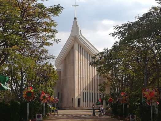 Foto 6: Een sneeuwpop voor de kathedraal, om bij 30 graden plus toch een zeker kerssfeertje te creëren. Het zou me overigens niets verbazen als er zich onder de kerkgangers mensen bevonden die nog nooit sneeuw hadden gezien en voor wie een sneeuwpop dus net zo vreemd is als een zevenkoppige Naga op de Dam in Amsterdam.Helaas bleek ’s avonds dat de informant Bert verkeerd had voorgelicht over de processie. Die had de vorige avond al plaatsgevonden. Een kleine pleister op de wonde was dat de kathedraal, die de vorm van de Arc van Noach heeft, mooi verlicht was.