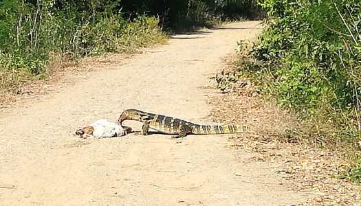 Foto 7: Een varaan die bezig is een dode hond op te peuzelenToch een flink reptieletje, zo’n varaan n nog giftig ook (kennis uit het Grote Reptielenboek). Als je daar onenigheid mee krijgt kan het nog wel eens uit de hand lopen. Daarom bleef ik op een veilig afstandje toekijken. De varaan vertrouwde mij net zo min als ik hem maar hij wilde zijn prooi niet zomaar aan mij afstaan. Ik was echter ook niet van plan om hem die prooi afhandig te maken. Soms lust ik honden wel eens rauw, bijvoorbeeld als ze luid blaffend achter mijn fiets aan komen, maar dan in figuurlijke zin. Dat ik de varaan zijn prooi niet betwiste, wist hij natuurlijk niet en daarom beleefden we beide spannende momenten. Uiteindelijk sleepte het reuzenreptiel zijn prooi de struiken in, waarna ik mijn fietstochtje kon vervolgen. Er kon hierna natuurlijk elk moment weer een grote varaan uit de rivier omhoog klauteren maar de kans dat die mij zou aanvallen leek mij klein genoeg om vrolijk verder te fietsen.