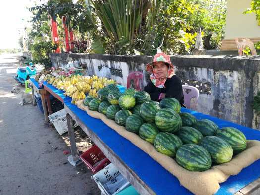 Foto 9: Bij een fruitstalletje langs de weg kocht ik de volgende dag een tros bananen en een kilogram mandarijnen. Links op de foto een van de braafste honden van Thailand. Het beest blafte niet, gromde niet en vloog niet naar mijn enkels en dat is een bijzonderheid in Thailand.In Ku Pueai Noi was weer een Khmer tempel te zien, een veel kleinere dan die van Phimai, maar wel erg mooi. Ik kwam er juist voor zonsondergang aan, nog precies op tijd voor een paar aardige kiekjes.