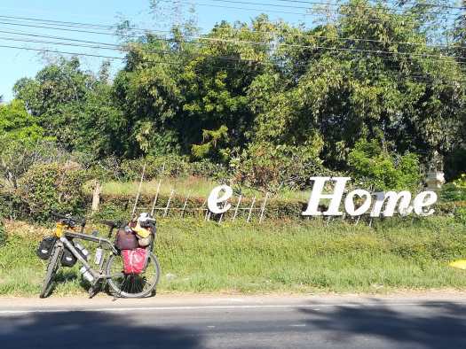 Foto 15: Met grote letters aan de weg aangegeven resort met de intrigerende naam ‘e Home’. Tegenwoordig is ons leven met alles wat er bij hoort voor een groot deel ge-electroniseerd: e-book, e-guide, e-bike, e-auto, e-sigaret, e-chess, e-mail etc. En hier dan plotseling een e-home, een electronisch huis, dus. Me afvragend of je hier werkelijk de nacht zou kunnen doorbrengen of alleen maar virtueel, fietste ik het gravelweggetje naar het e-resort op. Toen ik honderd meter verder het terrein op reed bleek het resort gelukkig niet ge-electroniseerd te zijn en ook niet gedigitaliseerd. Het was nog steeds reëel, zo reëel als een resort maar kan zijn.