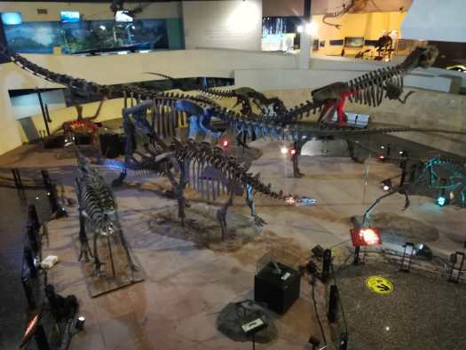 Foto 6: De grote zaal van het muzeum met een paar geraamten van roofdino’s. Helaas namaak, die skeletten. Nadat de botten160 miljoen jaar in de grond hebben gelegen is het allemaal niet meer zo gaaf als wat hier te zien is, vandaar deze nette copieen.