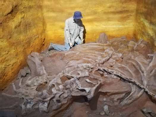Foto 7: Een copie (helaas weer) van een echt gevonden skelet. Ziet er na zo’n tijd toch nog redelijk herkenbaar uit!En nu wordt foto 1, waarmee we dit bericht begonnen, opeens begrijpelijker, want als iedereen die geraamten zomaar gaat aanraken is er van het hele muzeum over weer 160 miljoen jaar niets meer over.