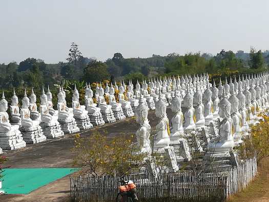 Foto 14: Vier rijen van 30 stuks met een grote ervoor. Dat maakte in 1 klap 182 Buddha’s (als ik me niet verteld heb, iets wat bij die aantallen makkelijk kan. Je ziet er zo 10 of 20 over het hoofd)In Sakhon Nakhon vond ik een aardig resort. Ik nam er een kamer maar nog voor ik mijn spullen naar binnen had gebracht hoorde ik achter me mijn naam noemen. Toen ik verbaasd omkeek, (want wie kende er nu mijn naam in Thailand?) was ik nog verbaasder, want achter me stond, ook met een opgetuigde fiets, een oude bekende: Bert Sitters, zo’n beetje de onderkoning van de jaarlijkse Fiets-en Wandelbeurs in Utrecht.