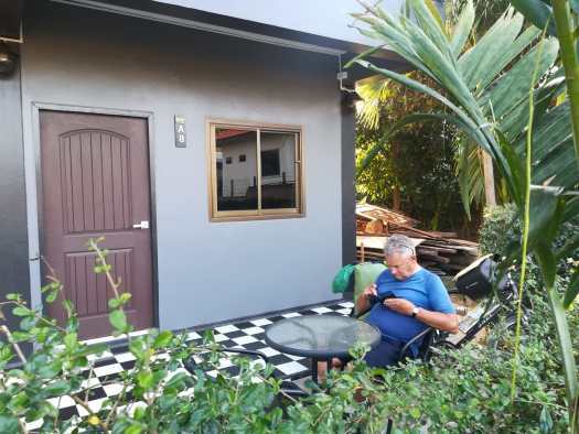Foto 15: Historische ontmoeting in Sakhon Nakhon op 23 december van het jaar A.D. 2022. Links Bert Sitters, rechts schrijver dezes.We wisselden ervaringen uit, maar nu moest er eerst gewerkt worden, door Bert althans. Snel zette hij zich aan een tafeltje voor zijn kamer om deze ontmoeting op Facebook te zetten.