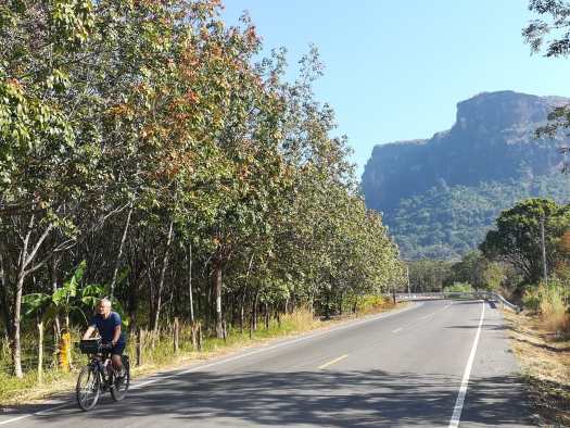 Foto 9: Bert weer wel op zijn geliefde ‘zoevende asfalt’. Op de achtergrond een mooie rotsberg. Aan zijn rechterhand een rubberboom plantage. We kwamen langs heel wat van die rubberboom plantages.