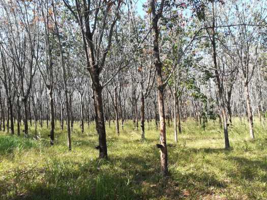 Foto 10: Een rubberboom plantage van dichtbij. Niet het mooiste bos dat je je kunt voorstellen. Let op de kleine bakjes aan de bomen, waarin de latex, de grondstof voor rubber, wordt opgevangen.