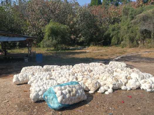 Foto 13: De oogst: een flinke stapel latexbonken. Ik vroeg me af hoeveel Schwalbebanden hieruit gemaakt gaan worden.Vanaf het guesthouse maakten we de volgende ochtend een aardig fietstochtje in de omgeving, waarna Bert terug ging naar het meer om op een strandje te gaan relaxen. (Eten, drinken en slapen, een vermoeiende vorm van relaxen, lijkt mij). Mijn argument dat hij die dingen ook allemaal thuis kan doen en dat je daarvoor niet tweemaal 10 uren in een vliegtuig gaat zitten, maakte op hem geen indruk. Het werd gewoon relaxen die middag!