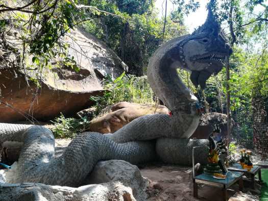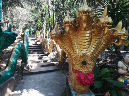 Foto 14: Begin van het pad naar de Witte Boeddha, bewaakt door twee vijfkoppige Naga’s. Hier is alleen de rechter Naga te zien. De linker zit links uit het beeld.Het pad omhoog was niet moeilijk. Eigenlijk was het zelfs heel eenvoudig: grotendeels een trap met erg veel treden. Hier en daar hing ook een ijzig steil en hoog laddertje aan de rotswand, maar als je je daar maar goed vasthield en rustig door zette, was er geen vuiltje aan de lucht.