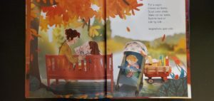 How could anyone feel surly or bored when every moment is so bright and crisp, and full of poetry, pie, cartwheels, campfires, marshmallows and music? Each scene is so deftly constructed, lit and photographed, your fingers will want to reach out and grab that rake or strum Grandpa’s beautiful blue guitar. Reidy’s rhymes are as waltz-y as they are warm, but it is Cotterill’s handiwork that really made me want to nibble on a page or two. “