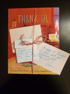 Then, a few weeks ago, a surprise package arrived from Samantha. It contained not only a copy of her beautiful collaboration with my friend Elaine Vickers, THANKFUL, but also this tiny, constructed painting from one of the 3-D “sets” from the book. I was over the moon to receive this very special gift.