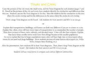 While this activity was written for classroom instruction, it’s easily adapted for low-tech, at-home learning. Rather than making copies, simply find photos of towns and cities in books or magazines and construct a Venn Diagram of your own.