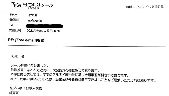 It is with great regret that we have learned about your case of fraud. Criminal penalties have already been imposed in this case in accordance with Brunei domestic law. Please be aware that neither the Embassy nor the Ministry of Foreign Affairs can get involved in any civil disputes.”