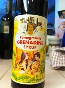 Tahiti Joe Pomegranate Grenadine Syrup, a product from the good people at the Tahiti Joe Company of Los Angeles, California. No date on this, but the $1.39 price tag puts it several decades back. I love the cool couple in their Hawaiian outfits enjoying their drinks.