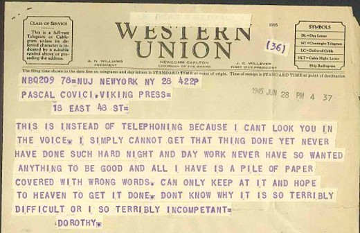 Anyone who has ever hit a wall whilst writing will find it difficult not to empathize with the dejected words of Dorothy Parker in this telegram, sent in 1945 to her editor, Pascal Covici. Such was her frustration, Parker couldn't even bring herself to ring him and explain.