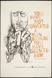 I don’t know if I can name or declare the worst sins we commit against each other; I do know that it is the power of words (and all other art) that uncover them. Whether it be the columns of New York Times writers Maureen Dowd or Charles Blow, the Op-Eds written by Derrick Jackson or Joan Wickersham of The Boston Globe, Maya Angelou’s poetry, Upton Sinclair’s muckraking, Alex Haley exposing racism and slavery, or Marilyn French breaking open the world of women, it is these chroniclers of life who keep us aware of those thin lines between right, wrong, and all the greys in-between.