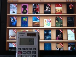The average cost of e-book on Ipad is $8.00 and though I couldn’t find an average across-the-board e-cost, I’m certain that it’s close. Some self-published books are available for 99 cents. Others, like the Janet Cromer’s heartbreaking chronicle Professor Cromer Learns to Read cost $9.99. The exquisitely written memoir In Her Wake by Nancy Rappaport is $11.92. State of Wonder, by Ann Patchett, a wonder to behold, is $12.99 for how many hours of riveting pleasure?