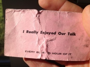 One is a business card I was given back in high school after I stopped to help a neighbor who was having car trouble. The man’s name was Pannebaker, and his kids were at my school. All I knew about him, beyond that, was that he was a printer. He mailed me a brief thank-you note and the card. It wasn’t a business card – it was harder to throw away than that. It was pink, and said simply: I REALLY ENJOYED OUR TALK. Then below, in smaller letters, EVERY BLASTED HOUR OF IT.