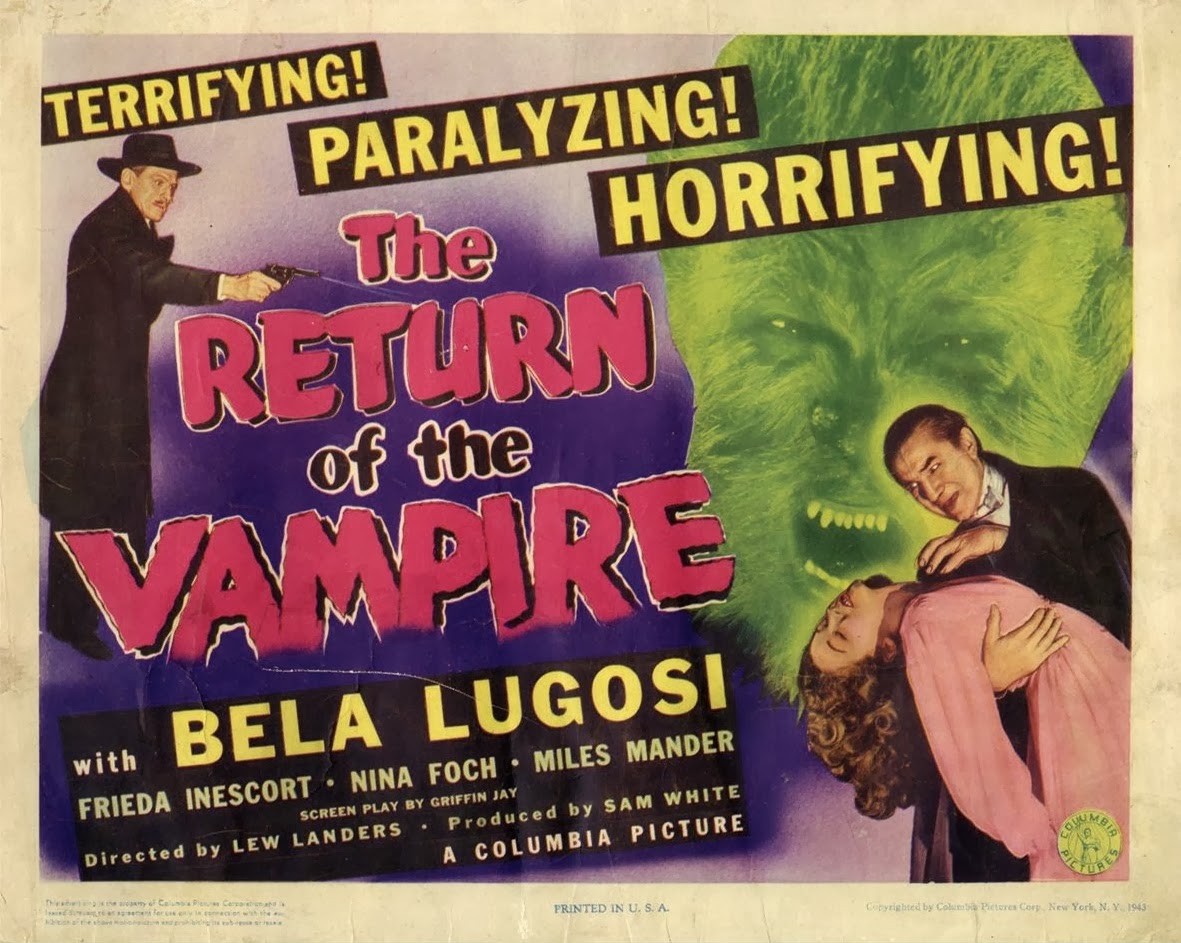 As Armand Tesla in Columbia’s "Return of the Vampire," Lugosi is a black magician who has cursed himself with vampirism. He is destroyed at the beginning of the movie, only to be unearthed by the mortar bombings of World War One. Military Police of the comedy relief variety pull the spike from his heart, believing it to be a length of shrapnel. Tesla revives and is aided by Andreas (Matt Willis), whose cloak of servitude is yak hair, a rubber snout and fangs. Andreas is a werewolf. This film was Columbia’s attempt to cash in on Universal’s own movie; "Frankenstein meets the Wolf Man" (1943), in which Lugosi played the blind Frankenstein monster.