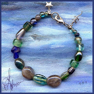 The first person I followed on twitter is a woman in California. Her avatar is a Roy Lichtenstein image, he is a favorite artist, and she writes smart interesting stuff. Today's world of connection by technology is still a strange one for me. Connecting with a stranger on twitter was a first step. Do I know the woman in California? No. Does she know me? No. This year I've been posting jewelry I make on twitter. I feel weird doing that; it's easier to promote other people. The CA woman admired some pieces. Those comments are a connection that transcend twitter follows, a thread that links us as individuals. This week, when she commented on a necklace, I wrote her. She likes my work and I wanted to celebrate that. I'm going to make you a piece. What do you wear? Bracelet, necklace, earbobs and in what colors? She wrote bracelet and she likes ocean colors. I crave freedom to create this way, to disappear in creative bliss, to select findings that tell a story. The story of a woman who likes ocean colors. I do not have to know her, to sit in a room with her, I can picture her wearing this physical manifestation of her story. A woman who likes ocean colors. Anyone who likes ocean colors needs to have her own private ocean. Each of the glass beads chosen had thought of her in the selection. Each glass bead is an individual ocean and circled together are the earth's water in perpetual cycle. The bracelet is on its way to California, to a woman I know likes ocean colors. With the little story she shared and the art circle closed, a new cycle is created in the world.