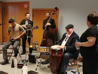 Jeff Cuny, bass. Jake Schwandt, guitar. RJ Spangler, percussion. Tbone Paxton, trombone and vocals. And whistling - that man can whistle. Check the schedule on the RJ Spangler website to find where you can hear more jazz music, blues, Planet D Nonet.