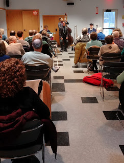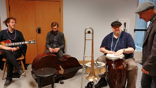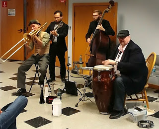 Spring cannot be far behind when listeners find a seat at Salem-South Lyon District Library to enjoy Mardi Gras jazz music with the RJ Spangler Trio and John (Tbone) Paxton. The group opened with Professor Longhair's ode to New Orleans and Mardi Gras. Next up, Art Neville's Mardi Gras Mambo. The link is Charmaine Neville's take. I love the growling baritone sax and the cover art, too. Art Neville just announced his retirement in December 2018.This concert appearance is always a welcome musical experience that also delivers an education. Before performing Canjun Country, Tbone shared a history of New Orleans and its music. An organic convergence of French Acadians who were expelled from Canada in the 18th century, with West African, Congolese musicology. Congo Square was a gathering place for drumming and music in New Orleans (restricted and banned except on Sundays until the 1920s.)