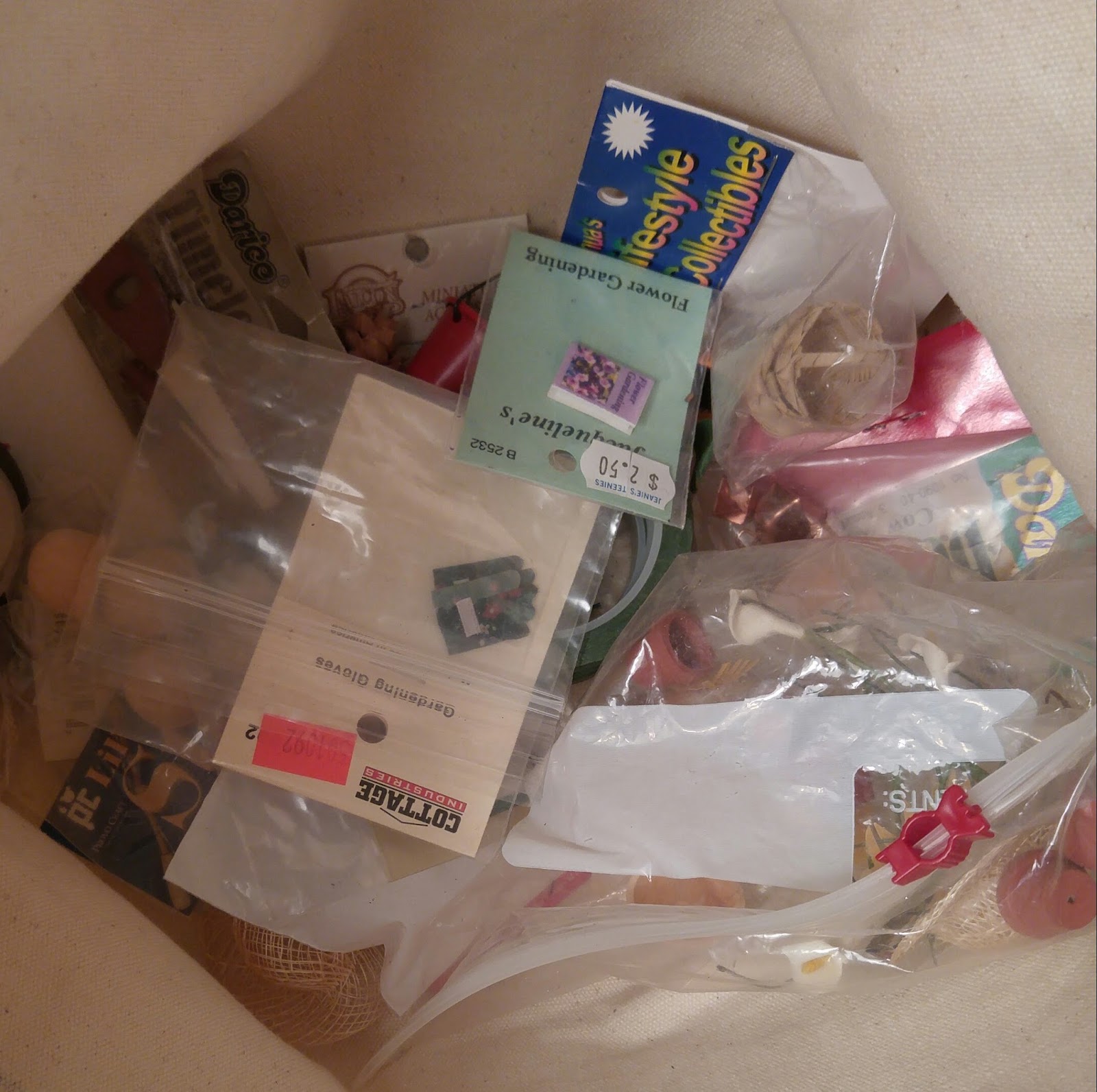 The bag of garden shed supplies. There is a receipt in here from 2004. The components included a printed set of seed packets, which I cut out, crushed seed beads [giggle] and glued together. I sold those a few years ago. As an emerging adult, I'm going to put this bag back where I found it. For now.